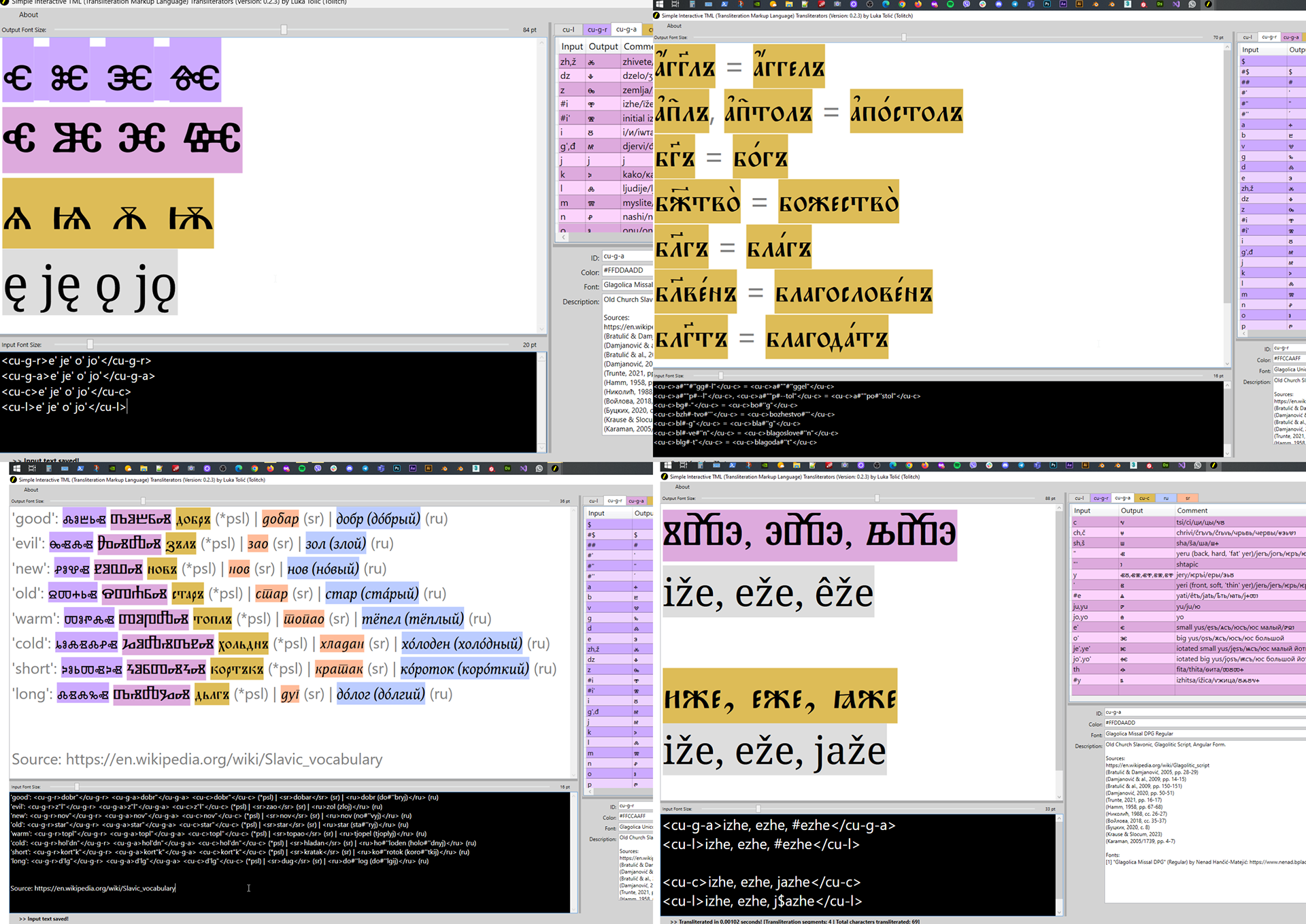 I’ve recently started learning the Old Church Slavonic language (OCS), the first literary slavic language. This language is traditionally written in two scripts, Glagolitic (round, angular, and cursive) and Cyrillic. Linguists (and other specialists) also use special subsets of the Latin script to transliterate the OCS for various study purposes. I therefore needed a simple and practical personal transliterator to transliterate between these three scripts and help me in my learning process. Since I wasn’t able to find a suitable online or desktop solution for this task, I’ve started developing this here Windows desktop application in C# (.Net 6.0), using WPF (Windows Presentation Foundation) to build the GUI. I also designeD myself the complete UI of the app.