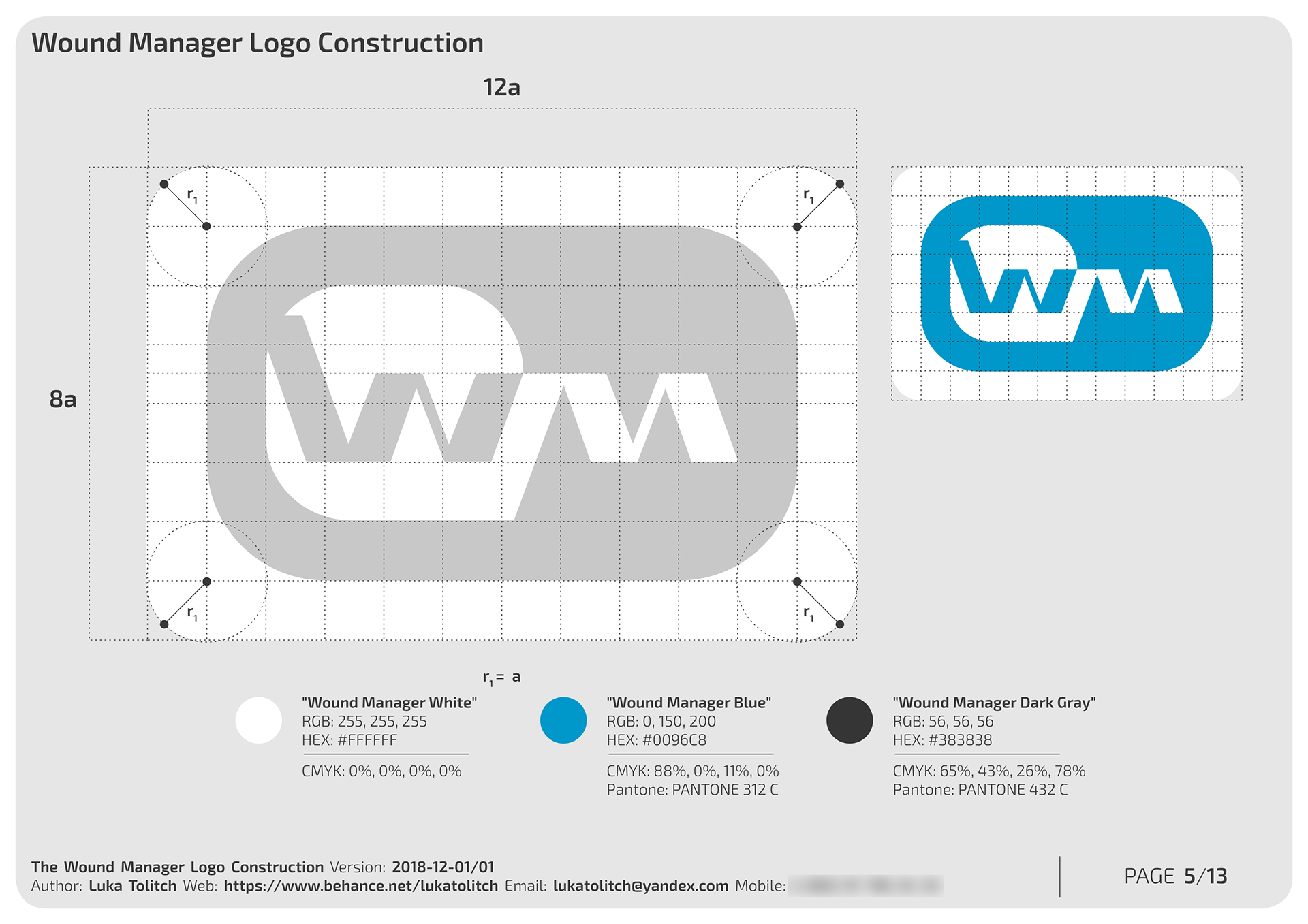 In 2011 I have constructed the logo for the medical application "Wound Manager" by Antonić d.o.o. from Zagreb (Croatia, EU). The application is used to organize various patient wound data, and so the logo concept illustrated a medical stitch to formally suggest the main purpose of the application. There were three different icon bounding rectangles to fit the logo in, and the construction was provided for each.